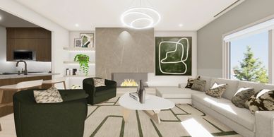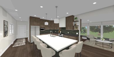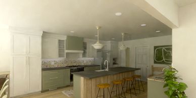 The clients seek a main level remodel for an open-concept layout connecting the kitchen, family room, dining room, and living room. They desire to merge two bedrooms into a spacious primary suite with a walk-in closet. Their preferred style is dark and moody, warmed by natural elements, including dark wood floors and olive green accents.