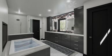 The second floor of this home was completely reimagined to create a primary suite full of energy and personality. The bedroom was relocated to make way for a spacious bath featuring a dramatic double-sided fireplace and a statement soaking tub. With bold patterns, layered colors, and thoughtful layout changes, this retreat embraces a dynamic spirit and a daring sense of style.