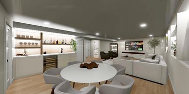 This basement renovation blends European influence with sleek modern design for a space that feels refined yet balanced. A limewash feature wall adds depth and character, while the clean, minimalist cabinetry keeps the look contemporary. Together, the textures and streamlined finishes create an understated sense of luxury.