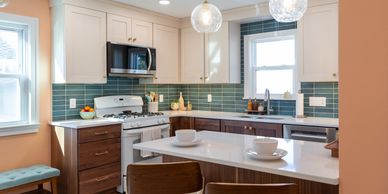 This remodel removed the wall between the kitchen and a small sitting room, creating an open, eat-in layout with improved flow. Mid-century inspiration guided the details—warm wood accents, floating shelves, and soft herringbone tile—balancing brightness and comfort to feel retro in spirit and refined for everyday life.