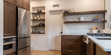 Once a commercial prep space for a food truck, this historic property was reimagined into a cozy mother-in-law suite. Rich wood tones, open shelving, and thoughtful finishes honor the building’s character while creating a warm, functional studio that feels both rooted in history and ready for modern living.