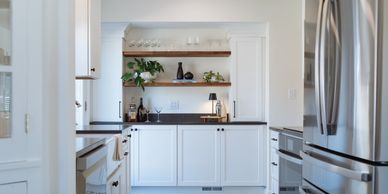 This kitchen was reimagined with new cabinet fronts, a soft painted finish, and the addition of a custom coffee bar to bring everyday ease. Subtle updates in color and detail gave the space a renewed sense of character, allowing it to feel both refreshed and thoughtfully complete.